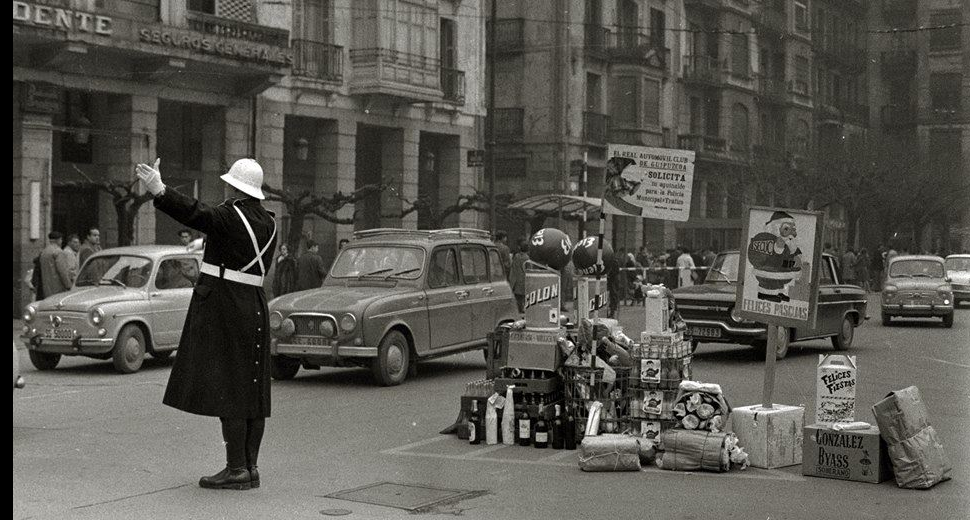 Fototeka Kutxa. Guardia Municipal regula el tráfico en el Boulevard de San Sebastián y recibe el aguinaldo