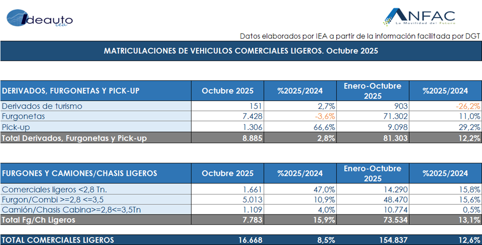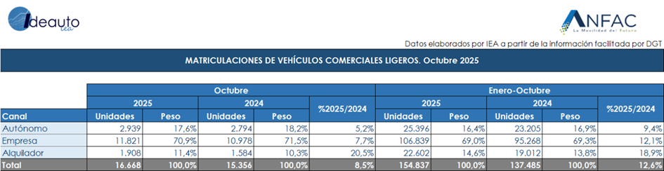 Las matriculaciones de vehículos comerciales ligeros ascienden un 8,5% en octubre, con 16.668 unidades. En el acumulado del año, se registra un total de 154.837 ventas, un incremento del 12,6%. En cuanto a las ventas por canales, el mercado a alquiladores logra el mayor crecimiento, con 1.908 vehículos, un 20,5% más. Por su parte, las ventas a autónomos y empresas crecen un 5,2% y 7,7%, respectivamente.