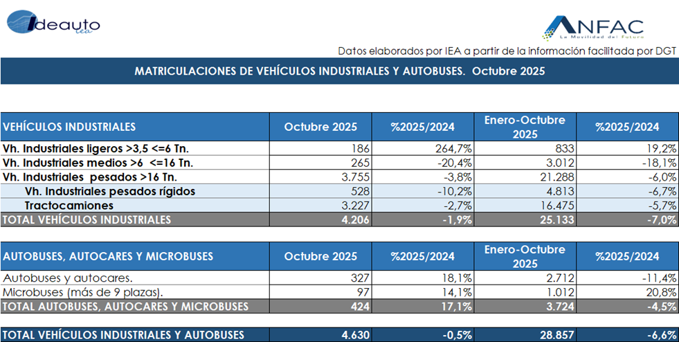 En octubre, tras dos meses de crecimiento, las matriculaciones de vehículos industriales, autobuses, autocares y microbuses vuelven a descender, con un retroceso del 0,5% y 4.630 unidades. Hasta el décimos mes, se acumulan 28.857 ventas, que supone una bajada del 6,6% respecto al año anterior.  Por tipo de vehículo en el mes, los industriales reducen sus ventas un 1,9%, con 4.206 nuevas matriculaciones y el mercado de autobuses y autocares logra 424 ventas, un 17,1% más que octubre de 2024.