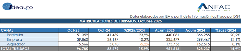 Respecto a los mercados en los diferentes canales, las ventas dirigidas a particulares y empresas vuelven a registrar un aumento, siendo, de nuevo, el canal alquilador el que anota un descenso. En concreto, los particulares suman 51.359 unidades, (+23,9%) y empresa, logra 39.860 ventas (+10,2%) en octubre. Por su parte, el mercado dirigido a rent-a-car retrocede un 5,2% en el mes, con 5.566 turismos.