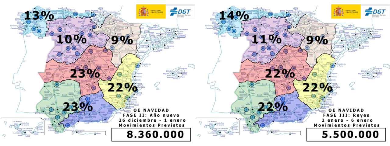 Para estos días, se prevé que se realicen por carretera 8.360.000 millones de desplazamientos de largo recorrido, unos movimientos a los que habrá que sumar los que ya se hayan realizado al comienzo de la Navidad con destinos principales segundas residencias, zonas de montaña para la práctica de deportes de invierno, zonas de atracción turística invernal y navideña como destinos elegidos para descansar, así como a áreas comerciales.